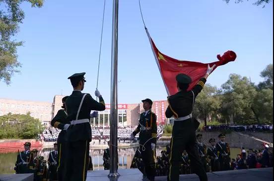 鲜艳的五星红旗在英姿飒爽的国旗班护卫下,伴随着雄壮的国歌声冉冉升起。