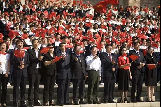 棋盘山下,博雅湖旁,辽宁何氏医学院八千名师生齐心赞颂,以自豪、澎湃、激昂、奋进的姿态同声演绎《歌唱祖国》,用歌声致敬祖国、讴歌时代、感受幸福,向新中国成立70周年献礼。