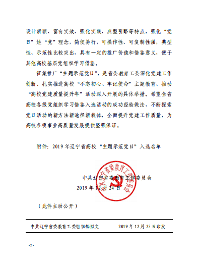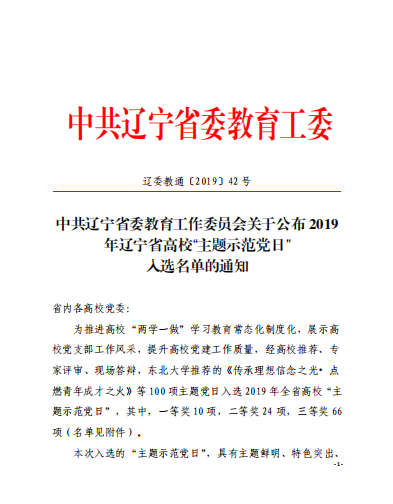中共辽宁省委教育工作委员会关于公布 2019 年辽宁省高校“主题示范党日” 入选名单的通知