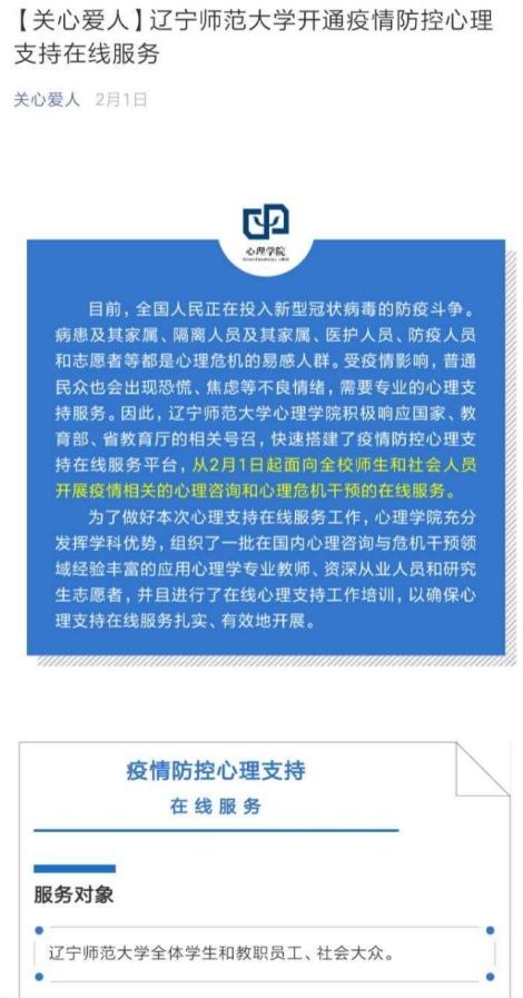 2月1日,在心理学院党总支的组织下,以心理发展与教育中心和应用心理学系为依托,快速搭建了辽宁师范大学心理支持网络平台,主要面向学校师生和社会民众提供每天12小时的心理援助服务。学院党总支有关负责同志和党员持续跟进,负责日常咨询值班以及志愿者的培训和督导工作,与其他教师和学生志愿者一道,先后为84位咨询人员提供心理咨询服务。同时,学院党总支副书记董成文在“关心爱人”微信平台上开辟专栏“应对新型冠状病毒肺炎——心理调适指南”并推送文章,利用音频做题为《防疫期间辅导员谈心谈话的侧重点及心理疏导的方法与技巧》的专题讲座。教师党员高雯为大连市甘井子教育局的中小学生录制了音频《当我们有了心理困扰该怎么办》,为大连市科协和大连交通广播主办的《战疫心理云课堂》,录制了音频《居家隔离人员如何减少消极情绪影响》,并从2月27日开始在大连交通广播陆续播出。