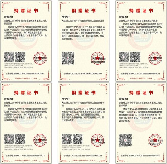 其作始于简,其将毕也必巨。“疫”灾无情人有情,一个党组织就是一座堡垒,一名党员就是一面旗帜,关键时刻,疫情就是考验党性的试金石。86岁的老党员王祥生教授捐款3000元,他这样写道:“自己为党中央的英明决策,全国人民的精诚团结、可歌可泣的事迹所感动,要为抗击疫情工作尽微薄之力。”76岁老党员樊希山教授的老家就在湖北,他说:“家乡的疫情是最严重的,自己无时无刻不在牵挂家乡情况,此次捐款1000元不算什么,都是自己应该做的。”身体患病的党员信晓丽在捐款时写到“在得知武汉疫情后,内心十分焦急,便通过大连市慈善总会向武汉捐款,在接到捐款的倡议后再次献出了自己的一份爱心。回想到自己在生病期间也曾得到了学校领导和所在支部书记及同志的关心和慰问,作为共产党员,更有责任和义务尽自己一份绵薄之力去回报社会,帮助更有需要的人。”