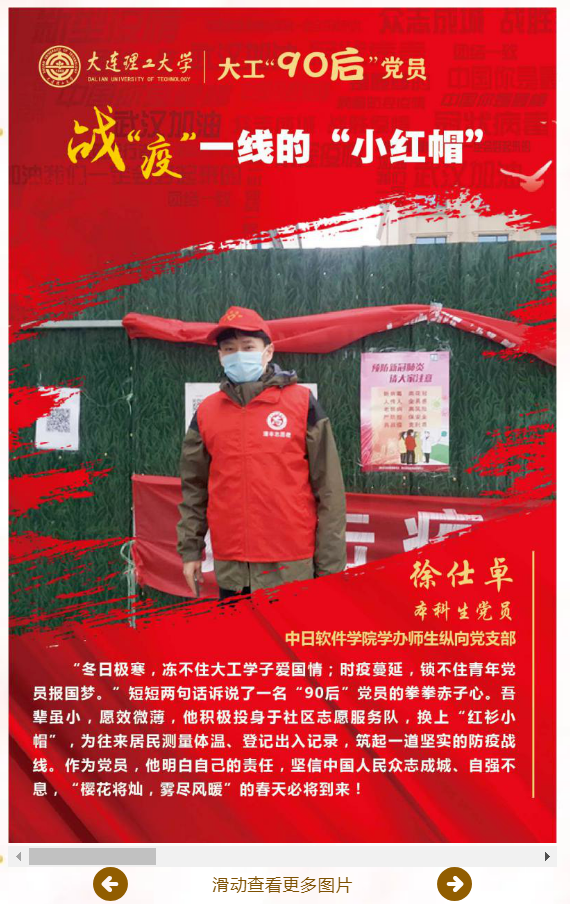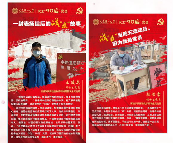 在这场如火如荼的防疫阻击战中,大连理工大学大批“90后”大学生党员主动参与社区乡村志愿服务、协助运行防疫微信网络平台、使用CAD软件设计街道防疫规划图、为防疫一线工作人员子女义务在线学习辅导……他们将爱国情付诸于报国行,用实际行动弘扬和传承着“大工红色基因”,为国家建设、民族复兴凝聚起磅礴的青春力量。