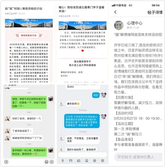 自新冠病毒疫情防控工作以来,大连工业大学党委高度重视学生工作,分管校领导靠前指挥深入工作一线,通过线上工作群发布工作通知和防控信息,逐一参加基层学院学生工作会议,围绕疫情防控期间如何做好学生工作进行细致、深入指导。学生工作部顺应形势,充分发挥线上育人功能,强化学生思想教育引导,落实立德树人根本任务,按照整体部署安排,以学生为中心,以疫情为命令,以自主研发手机APP“大学印象”为载体,以抓主线、强日常、重引导、稳状态为总体工作思路,以九个“确保”为具体抓手全方位开展工作,有效保障了思想政治教育和线上教学同向推进、相辅而行,做到管理常态化、教育常态化。