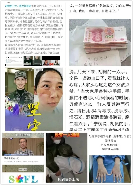 疫情面前凝心聚力,开展《情致武汉、共度难关》《聚爱工大、武汉加油》《你身边的战“疫”故事》等53项网络活动,共有9000人次参与,发布网络话题21个,通过线上思政凝聚共识,传播正能量,引导学生树立爱国主义精神,不造谣、不传谣、不信谣。在“大学印象”APP上采用微视频接力的方式,向战斗在抗击疫情一线的医务工作者和社会各界人士致敬,引导学生肩负社会责任、使命担当。