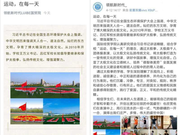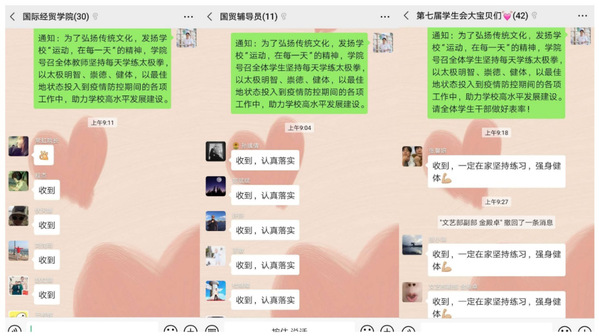 居家战疫,学练太极健体。为了弘扬传统文化,加强疫情期间师生的身体健康,辽宁对外经贸学院以太极拳为切入点,建立文化认知,号召全体师生坚持每天练习太极拳,以太极明智、崇德、健体,以最佳的状态投入到学习、工作和生活当中,全力做好疫情防控期间的各项工作,为学院高质量发展贡献力量。