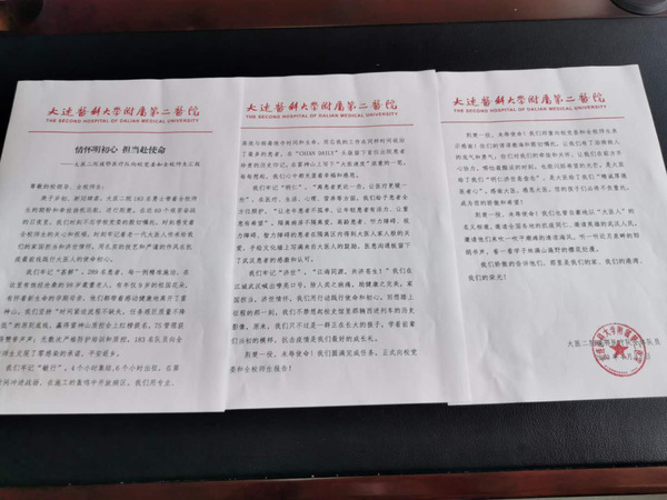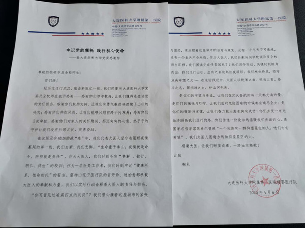 近日,大连医科大学党委分别收到了附属第一医院、附属第二医院援鄂医疗队的来信。信中,医疗队员们真挚感谢学校党委、全校师生给予他们的关心和关爱,详细汇报了医疗队在武汉抗疫一线医疗救治工作情况,情真意切地表达了大医人在战“疫”中所体现出的家国精神和济世情怀以及大医与国共克时艰的责任和担当。