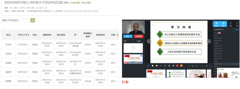 按照《关于2020年春季党校入党积极分子培训工作安排的通知》要求,学院各分党校积极行动,党总支书记亲自做好研究和推动工作。分别制定学习计划,确定授课内容和时间,邀请党校教师,采取“直播教学、录播教学、慕课教学、研讨教学”等教学模式,利用超星泛雅网络平台、钉钉、微信、腾讯会议等媒介,围绕中国共产党章程、中国共产党党史、习近平新时代中国特色社会主义思想、全国教育大会精神、党的十九届三中和四中全会精神以及入党积极分子确定、党员发展及培养程序、文书书写规范等方面,进行理论授课、专题讨论学习、观看视频、撰写心得体会,并完成了线上结业考试。