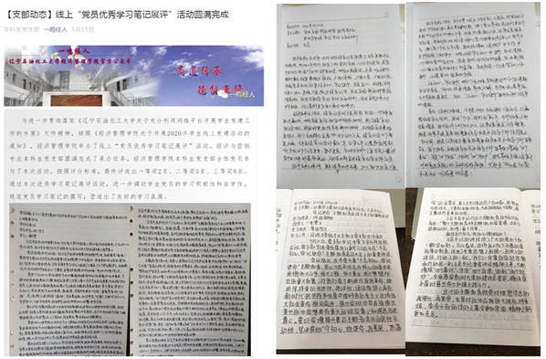 自疫情发生以来,辽宁石油化工大学经济管理学院本科生党支部借助网络平台进行理论学习,通过强国会议平台、腾迅会议等进行集中学习,会后学生党员就学习内容进行再总结,认真撰写了学习笔记。5月10日,经济与营销专业本科生党支部承办党员优秀学习笔记展评活动,对照各支部学习计划,按照学习态度、学习内容、笔记撰写、学习时间等五项标准进行评选。在评选中,学生党员都能做到按照学习计划进行集体学习和自学,并及时进行记录,内容充实、字迹工整,显示出各位党员踏实严谨的学习态度。通过现场查阅和评选,共选出15本笔记评为“党员优秀学习笔记”。