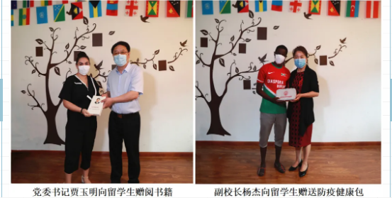 座谈后,贾玉明和杨杰分别为每位留学生赠阅了《习近平谈治国理政》(英文版)一书,赠送了学校防疫健康包并与留学生合影留念。