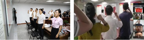 座谈会后,举行了新党员入党宣誓、老党员重温入党誓词活动,由董玉宽领誓。与会人员在会前参观了学校疫情防控工作事迹展。