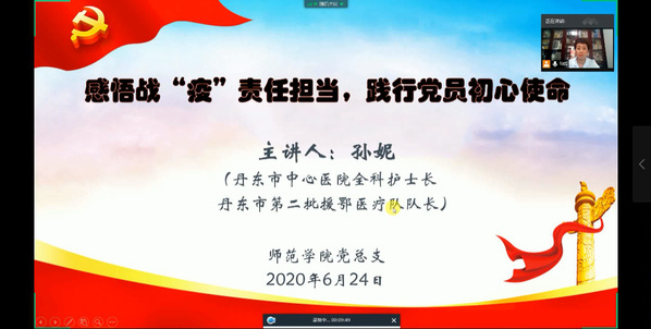 为深入学习贯彻习近平新时代中国特色社会主义思想,引导广大党员在统筹推进常态化疫情防控和学校事业发展的实践中,进一步坚定理想信念、锤炼党性、践行初心使命,凝聚起“不忘初心、牢记使命”的强大力量,辽东学院通过“云党课”的形式,邀请丹东援鄂抗“疫”英雄为广大党员上党课,讲述一线抗“疫”经历、诠释伟大抗“疫”精神。