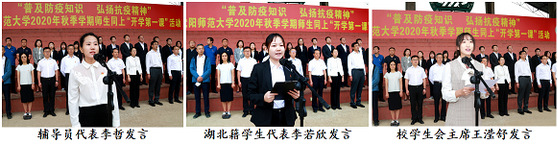 贾玉明代表学校领导班子和广大教职员工,向返校归来的同学们表示热烈欢迎,强调举行此次活动的重要意义,勉励广大学生从自身做起,从点滴做起,从身边学起,希望同学们认真践行两个“懂得”和两个“倡导”。一是希望同学们懂得珍惜。要珍爱生命,珍惜健康,严格做好自身防护,严守作息时间,加强体育锻炼,注重健康饮食,养成良好的学习生活习惯;要珍惜时间,有效科学利用青春韶华,积极回补疫情期间的学习缺漏,不断提升能力和素养;要珍惜美好的学习环境,珍惜学校精心营造的良好氛围,努力提升专业素养,健康成长,砥砺成才。二是希望同学们懂得感恩。要感恩党和政府凝聚人民齐心抗击疫情,深刻感受中国共产党“人民至上”的价值追求,从中华民族守望相助、自强不息的优良传统中汲取精神力量;要感恩抗疫英雄、白衣战士,感恩在这场战疫中无私奉献的人,学习先进典型、提升报国本领;要感恩日夜陪伴的父母和家人,感恩疫情期间克服各种困难线上教学的老师,感恩协助学校做好毕业、返校和迎新相关工作,为大家们竭诚服务的志愿者同学们。以自身的努力奋斗和健康成长回馈社会。三是希望同学们倡导节俭之风。要认真学习贯彻习近平总书记“制止餐饮浪费、厉行节约”的重要指示精神,按照学校的部署和要求,树立正确的价值观和消费观,从一日三餐不糟蹋一粒粮食开始,在寻常日用和学习工作中不铺张浪费,不过度消费,更不奢靡炫富,用实际行动传承勤劳节俭的中华传统美德,营造“节约光荣、浪费可耻”的良好氛围。四是希望同学们倡导文明素养。作为以培养教师为主的师范大学,培养学生较高文明素养至关重要,学校将持续从抓好校园基础文明教育入手,规范言行文明养成良好习惯,强化诚信教育、挫折教育、生态文明教育和心理健康教育,积极教育引导广大同学围绕树立良好的社会公德、职业道德、家庭美德和个人品德。讲话最后深情引用习近平总书记回信勉励北京大学援鄂医疗队全体“90后”党员的话,鼓励广大同学们要“不惧风雨、勇挑重担,让青春在党和人民最需要的地方绽放绚丽之花。”