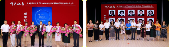 会议宣读辽宁省2020年“一先两优”获奖名单和大连市嘉奖教师名单、学院2018-2019年度“两优”表彰决定,学院2020年“师德标兵”表彰决定和学院2020年“从教30年”荣誉纪念名单。全体学院领导为先进集体和个人颁奖,部分教师代表在大会上作了发言,全体与会人员共同观看了学院2020年师德标兵育人事迹宣传片《师道》。