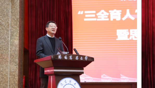 会上,董玉宽传达了党的十九届五中全会和全省会议精神,充分肯定了学校“三全育人”综合改革及建设工作开展以来,学校各单位、各部门、广大教职工做出的努力和取得的成绩,分析了当前面对的新形势,对推进学校“三全育人”工作长效化机制化建设、做好新时代思想政治工作进行部署。讲话进一步强调,加强和改进思想政治工作,责任重大,使命光荣。学校上下要凝聚思想共识,开拓工作思路,创新工作举措,重点从三个方面强力推进:一是要坚持用习近平新时代中国特色社会主义思想武装师生头脑。要持续推进习近平新时代中国特色社会主义思想“三进”工作,加强“思政课程”和“课程思政”建设。要不断提升师生思想政治素质,教育引导师生牢固树立共产主义远大理想和中国特色社会主义共同理想。要突出理论与实践的有机结合,积极推进思想政治工作的理论研究与实践探索,用好学校文化资源加强“四史”教育。二是要坚决守好意识形态工作阵地。要牢牢掌握意识形态工作的领导权、主动权、话语权,全面压紧意识形态工作责任制,强化意识形态风险意识。坚决筑牢意识形态的工作防线,严明课堂教育管理和教学秩序,持续提升管网治网能力,全力推动“省中心”建设,打造出具有建大特色的网络思政品牌。突出用主流价值塑造人,推动构建以“五育并举”为引领的“十大文化”育人体系,打造文化亲润、文化感染、文化熏陶的育人环境。三是要加强思想政治工作的组织领导。要强化党对思想政治工作的领导,各级领导干部要提高政治站位,切实担负起政治责任和领导责任,将思想政治工作纳入重要议事日程。要进一步构建思想政治工作体系,坚持完善党委统一领导、党政群团齐抓共管、部门各负其责、各单位广泛参与的思想政治工作大格局。要加强思想政治理论研究工作,深化研究与实践活动,努力推出一批有价值、有分量的研究成果,不断提高学校思想政治工作的科学化水平。