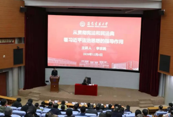12月4日是第七个国家宪法日,沈阳建筑大学举行习近平法治思想暨宪法、民法典专题报告会,全国人大代表、国家一级律师、辽宁安行律师事务所创始合伙人李宗胜应邀来校作专题报告。学校党委书记董玉宽作总结讲话,学校领导班子成员、党委委员,校院两级党委理论学习中心组成员及马克思主义学院研究生代表在现场聆听报告,报告会面向全校师生同步网络直播。