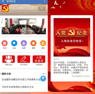 在支部党建社区中,专门开设了“入党纪念日”主题板块。支部统计了每名党员的入党时间,网络党建社区自动实现为每名党员在“入党纪念日”这一天送上祝福信息。入党纪念日祝福是党支部对每名党员的政治关爱,也是对每名党员的政治提醒,过“政治生日”使党员增强了身份感、使命感和责任感,党支部的凝聚力得到了加强。