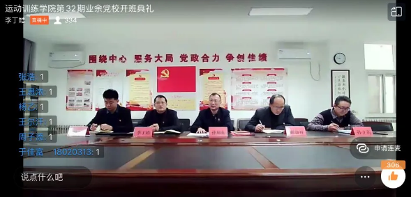 沈阳体育学院运动训练学院第32期学生业余党校开班仪式。运动训练学院是沈阳体育学院设立较早、规模最大的院系之一,专业底蕴深厚,冰雪特色鲜明,党总支紧扣立德树人根本任务,坚持以学生发展为中心,坚持“理论学习不停步,党性教育不停歇”,利用学生寒假期间,积极探索“线上业余党校”育人模式,创新线上培训形式,精心筹划日程安排,科学设计党课内容,针对343名学生发展对象、入党积极分子和优秀团员,专门聘请辽宁省委党校教授、学校思政教研部教师和党群部门同志讲授党的发展历程、新党章解读、意识形态教育、入党启蒙教育等40学时专题党课,同时采取线上观影、线上研讨、线上作业等方式,积极引导新时代体育大学生全面准确理解习近平新时代中国特色社会主义思想和党的十九届五中全会精神,进一步加强理论武装,坚定理想信念,端正入党动机,增强党员意识,提升党性修养,争做新时代“四讲四有”合格党员。