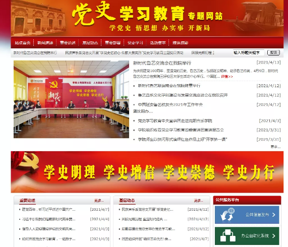 开设专题网站,为师生党员开辟学党史、悟思想的新窗口。开设党史学习教育专题网站,设置新闻速递、重要论述、基层动态、重要论述、活动集萃、党史学习、媒体掠影7个栏目。网站集部署、学习、互动、服务等功能于一体,全面展现党史学习教育进展情况和典型经验,便于全院党员干部和师生及时了解学习教育动态、有效互动交流。