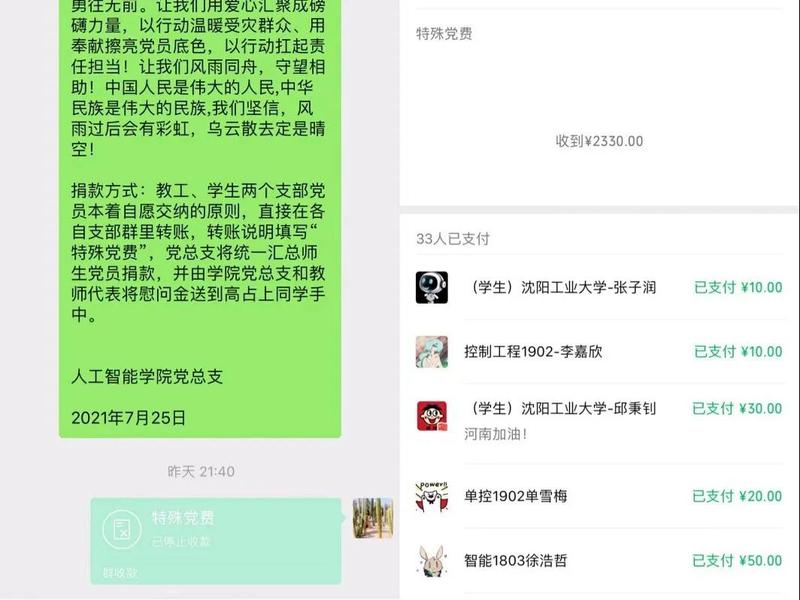 在得知该同学情况后,人工智能学院及时反应,安排辅导员对其进行心理疏导并为其添置了生活物资。学院党总支于7月25日晚间向教工、学生两个党支部发出了《弘扬伟大建党精神 彰显党员初心本色——关于向我院河南籍学生高占上捐款的倡议书》,号召基层党组织充分发挥战斗堡垒作用、广大党员充分发挥先锋模范作用,在此非常时期交纳一份“特殊党费”,帮助高占上同学一家渡过难关。两个支部师生党员积极响应,截止7月26上午,共收到学院48名师生党员自愿交纳的“特殊党费”9080元。其中,教工党支部13名党员交纳6400元;学生党支部35名名党员交纳2680元。