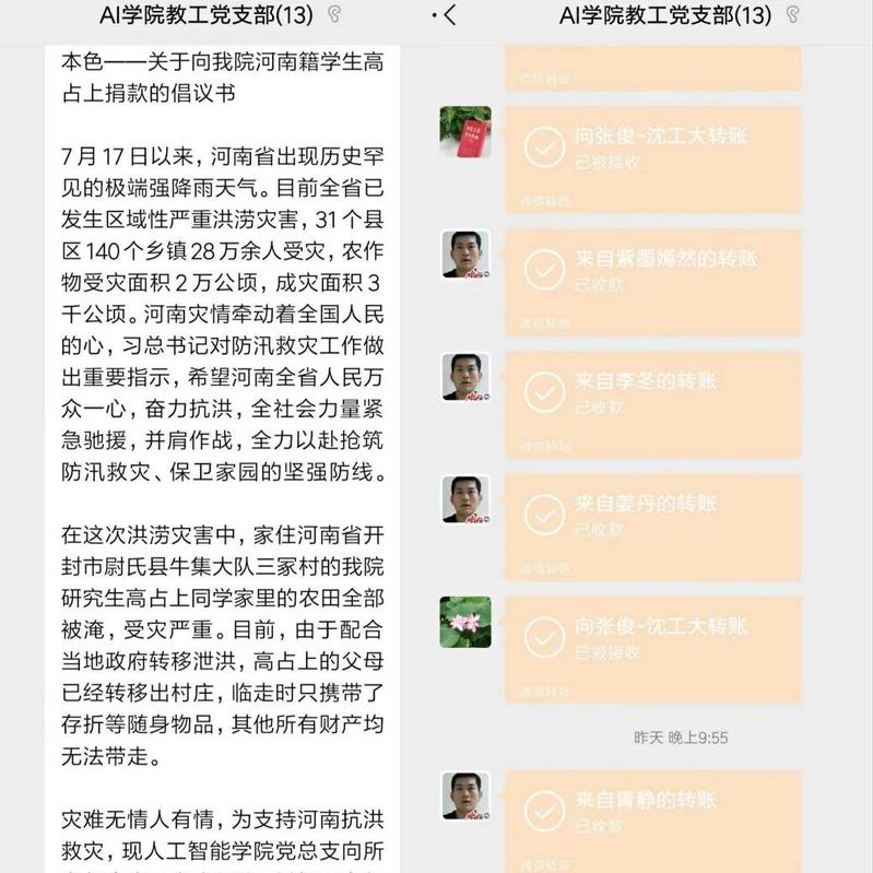 近日,河南省出现历史罕见的极端强降雨天气,郑州等城市发生严重内涝,一些河流出现超警水位,个别水库溃堤,造成人员伤亡和财产损失。河南灾情牵动着全国人民的心,沈阳工业大学党委高度重视,面向广大师生员工、社会各界校友发出了《学党史 践行动 聚大爱 渡难关——关于向河南郑州等地受灾群众捐款的倡议书》。人工智能学院党总支密切关注,通过公众号对学生进行安全教育、开通帮扶渠道为学生提供心理辅导。同时,通过电话家访对学院河南籍学生家庭受灾情况进行摸底调查。经排查,了解到家住河南省开封市尉氏县牛集大队三冢村的研究生高占上同学家里受灾严重。由于强降雨水位持续上涨,该同学家里农田全部被淹,由于泄洪需要,其父母转移时只携带了存折等随身物品。高占上同学暑期留校,心系家乡,情绪焦灼。