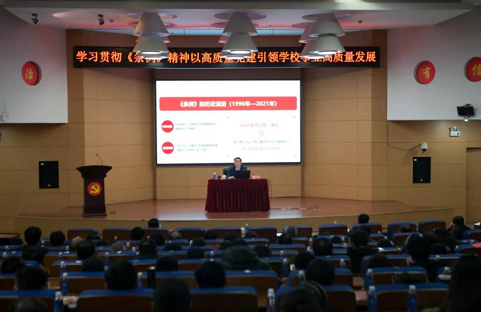 翟文豹在报告中指出,新修订的《条例》是党的理论创新、实践创新、制度创新的具体表现,是提高高等学校党的建设科学化水平的本质需要,是保证高等学校社会主义办学方向的根本需要,是推动高等教育事业高质量发展的迫切需要。强调要不折不扣地落实新修订《条例》的各项工作要求,准确把握高等教育发展的历史方位,坚持问题导向,着力补齐学校发展短板,以高质量党建引领学校高质量发展。