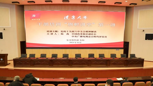 11月25日,辽宁大学举办干部培训“旗帜讲堂”,首讲依托“人民学习·格局屏天下”平台,直播听取中国改革报社副社长、中央广播电视总台特约评论员杨禹讲授的“党的十九届六中全会精神解读”专题辅导报告。蒲河校区各单位党组织书记、副书记,新提任处级领导干部、年轻干部、机关科级以上干部、优秀党员代表现场参会,崇山校区、武圣校区处级以上领导干部线上参会。