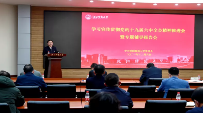 为进一步学习宣传贯彻党的十九届六中全会精神,推进党史学习教育走深走实,12月6日,沈阳师范大学党委组织召开学习宣传贯彻党的十九届六中全会精神推进会暨专题辅导报告会,会议邀请中央实施马克思主义理论研究和建设工程首席专家、清华大学习近平新时代中国特色社会主义思想研究院常务副院长、沈阳师范大学特聘教授肖贵清教授作专题辅导。本次会议采取线上视频会议的形式,学校党委理论学习中心组成员、机关中层干部在主会场参会,各单位党政班子成员、党支部书记、组织员、辅导员,学习贯彻党的十九届六中全会精神学校宣讲团成员在分会场参会。学校党委常委、副校长许金龙主持会议。