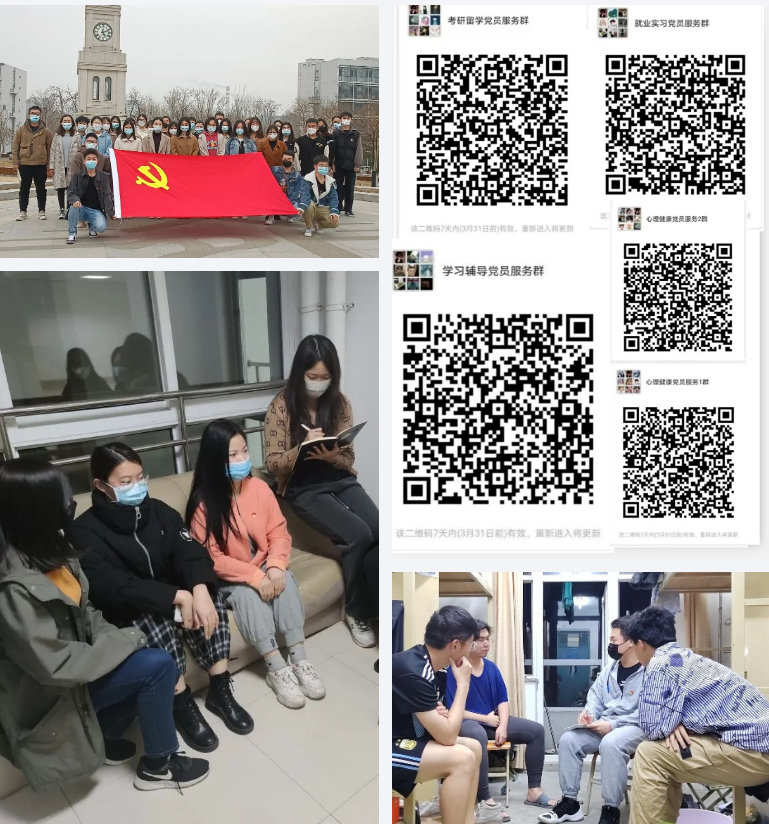 临时党支部党徽熠熠闪光,犹如暖阳驱散疫情阴霾。作为教育部第二批“党建工作标杆院系”培育创建单位的商学院党总支,结合疫情防控要求和学生在寝室线上学习实际,将党支部建在学生寝室里,成立由在学校师生党员共计50人组成的战“疫”临时党支部,党支部下设学习辅导党小组、考研留学党小组、就业实习党小组、2个心理健康党小组等5个党小组,为在校生开展服务工作。连日来,临时党支部的师生党员以身作则,将校园打造成为疫情防控的坚强堡垒。党员们走进寝室,第一时间解决实际困难120余件,用心作答“我为群众办实事”的考卷,将鲜红的党旗牢牢地插在校园抗疫一线。