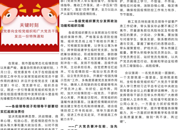 学校党委第一时间吹响集结号,统一认识,提高政治站位。学校疫情防控工作领导小组充分利用信息化手段完善校内组织架构,建立起学校党委、二级党组织、基层党支部“三线联动”疫情防控网络指挥工作系统,确保校园封闭管理期间学校党委各项防控部署及要求通过互联网迅速下达并组织落实。学校仅用半天时间完成线下转线上教学、在校转居家办公的无缝连接;20个党总支(直属党支部)、105个党支部、3000多名党员以疫情为命令,迅速集结,划分党员责任区177个,组建党员突击队19个,设立校园先锋示范岗206个;以学生公寓为单位,建立临时党支部5个,成立学生党员寝室防疫工作队,全力配合封校期间网格化管理;2小时内集结起10组、100人的教工志愿者队伍……从学校党委“中枢神经”到每名党员“毛细血管”,学校迅速构建起党委领导、党员带头、校内外联动、全员参与的疫情防控工作机制。