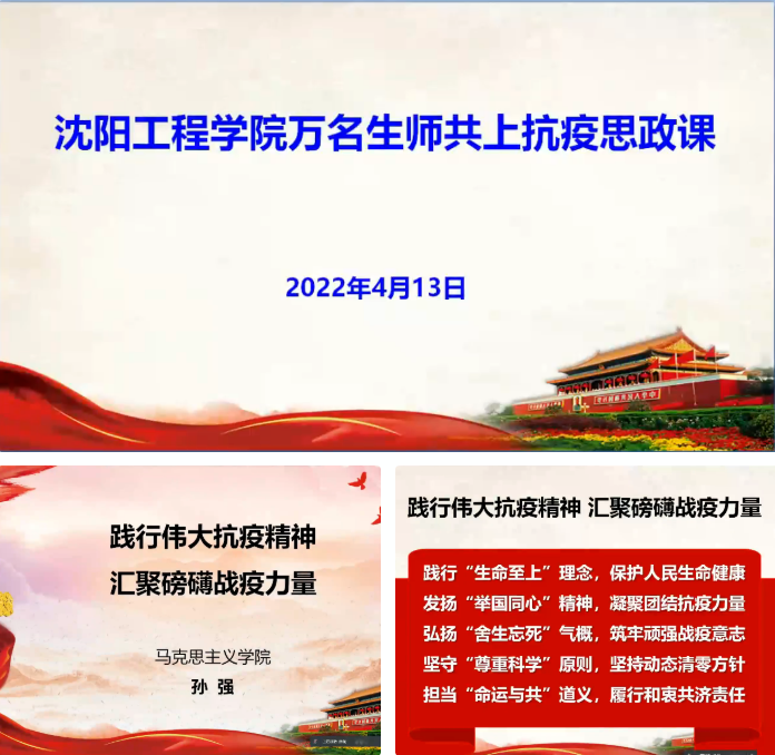 为深入学习贯彻习近平总书记关于疫情防控工作的重要讲话和指示精神,弘扬伟大抗疫精神,落实思政课在立德树人中的关键作用,引导学校师生坚定信心、共克时艰,将抗疫精神转化为育人力量,近日,沈阳工程学院抗疫“大思政课”在“云端”开讲。课程由马克思主义学院院长孙强教授主讲,学院党委书记佟刚、院长王国辉、副院长宋吉鑫及学院师生共同在线观看了课程直播。