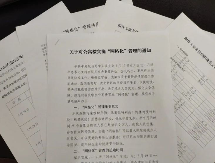 3月16日,学院防疫指挥部连夜研究公寓“网格化”管理实施举措,深入研讨就餐、卫生、如厕、洗浴、文体活动、核酸检测等各个环节实施保障流程。3月18日,学院防疫指挥部出台《关于对公寓楼实施“网格化”管理的通知》,并制发《“网格化”管理动员书》,明确《公寓管理组织架构及公寓楼楼管理服务专班人员名单》《公寓楼管理服务专班人员职责》《自由活动内容及时间安排》等系列配套文件。同日下午,以专业班级为单位,开展线上班会,广泛深入动员,得到学生高度理解与支持,3月19日开始对全院学生公寓楼实施“网格化”管理。