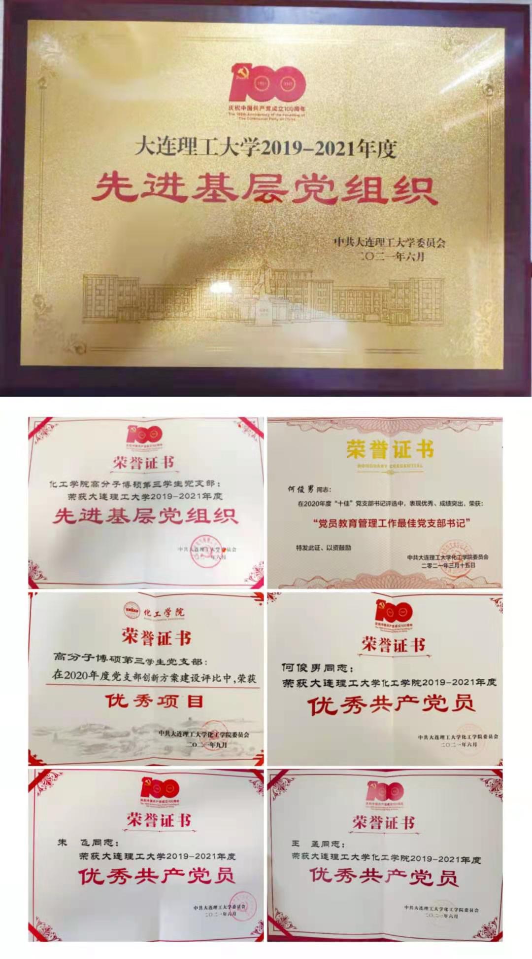 化工学院高分子博硕第三学生党支部及部分党员荣誉证书