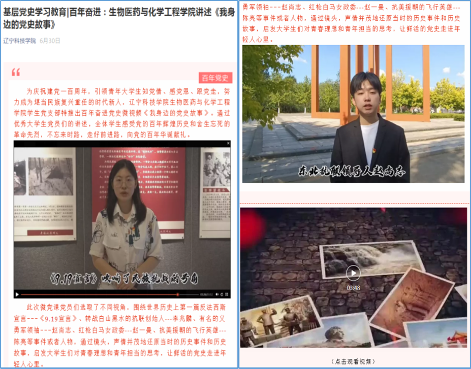 同时创新党史宣讲模式,以“百年奋进,我身边的党史故事”为主题,组织学生党员通过查询红色书籍、家乡地方志、革命英雄传记,浏览人民网、“学习强国”学习平台、各地知名的革命纪念馆等网上宣传材料,反复诵读党史学习读本,挑选自己感触最深的党史故事,编辑录制成《我身边的党史故事》微党课小视频15集。在全院师生中广泛宣传推广,在同学中引起广泛关注和好评。