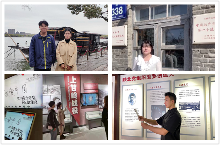 学生们在浙江省嘉兴市“中共一大”会址南湖红船、吉林省中共长春市第一通讯站、