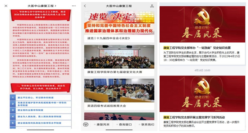 大连医科大学中山学院康复工程学院党支部不断将理论联系实际,大力推进特色主题教育“1+2+3模式”,成功举办“重温百年党史,传承红色基因”建党百年主题知识竞赛、“奋斗百年路,启航新征程”学党史主题演讲比赛、“风雨苍黄百年路,高歌奋进新征程”“创造百年辉煌,开启新兴伟业”党史宣讲活动、“砥砺奋进明初心,青春使命勇担当”毕业生最后一次党课等活动。康复工程学院学生荣获辽宁省首届康复技能大赛“三等奖”、辽宁省普通高校大学生日语技能大赛“一等奖”、辽宁省第二届中医药知识与实战技能大赛“团体二等奖”、“中国梦·强军梦”大学生爱我国防演讲比赛“二等奖”等多项荣誉。