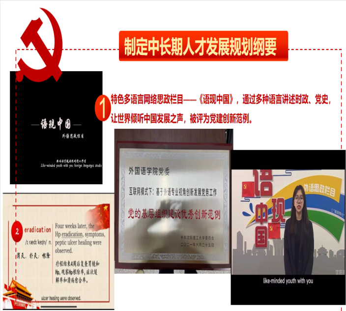面对新形势下党支部建设的新挑战,党支部及时总结经验,深入推进创新,以“为者常成,行者常至”自我鞭策,强化党支部思想引领作用。党支部依托网络思政大潮,结合外国语学院专业特点,主动请战参与外国语学院党委申报的特色双语网络思政栏目——《语现中国》视频录制,让学生党员成为讲好中国故事的主讲人,通过多种语言与中文相结合的方式讲述党史等内容,现已录制10期,总阅读量1428次。开展线上“语书为友”专题栏目,以“建党百年”为主题,通过分享一本本好书,引导学生在读书中思考,在思考中成长,在成长中历练,营造良好学习氛围,达到“润物细无声”的育人效果。运用在线互动直播方式,向铁岭枫树岭国际学校学生传播红色兵工文化,以党建交流促进优质生源基地建设。深入实施校园先锋工程,建强师生沟通渠道,开展“三位一体”精准帮扶。党支部书记从统筹、落实、回检三方面发挥积极作用,调动支部党员在学生思想教育、职业规划和学业帮扶上贡献力量,以党群融合带动学风建设,引导学生树立正确的世界观、人生观、价值观,守正笃实、久久为功。实施党员扶学工程,坚持党员朋辈学业帮扶“四导”机制,即支部引导、党员辅导、学生主导、学院倡导。创新党员学业帮扶新思路,推进学习活动向公寓转移,打造党员帮扶云平台,通过勤监督、常临检、看问题、找差距的方式,确保帮扶工作落到实处。