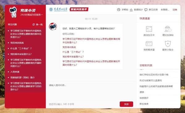 党建小灵:智能服务助手“党建小灵”面向全校基层党务工作者和全体师生党员提供了“政治生日贺卡、理论加油站、党务智多星、服务小贴士”四个方面的指导服务,在党员理论学习、基层党务办理等方面实现人机互动,提升了基层党建服务效能。