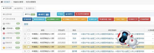 发展党员:发展党员管理服务模块实现了“入党申请人——积极分子——发展对象——预备党员——正式党员”全过程、全周期的动态分类管理服务和电子存档。党员师生可随时查阅入党成熟度等信息。党务工作者更方便准确地了解各类成熟数量,有助于科学制定党员发展计划,分析解决发展党员工作的问题,提升了发展党员的质量,有助于提高发展党员工作的针对性和有效性。