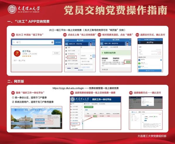 党费交纳:交纳党费模块,综合考虑学校不同校区地域政策差异,在职教职工不同的用工类型等诸多因素对党费核定标准带来的影响,在广泛调研分析的基础上,梳理固化出全校六种党费计算模式。在财务处、网信中心等部门的大力支持下,打通数据互联互通壁垒,实现了师生党员党费交纳标准月动态核算。建立适用于不同人群的手机i大工APP和网页版,支持微信、支付宝、云闪付等多种支付方式的党费交纳平台,实现了全校师生党费月动态核定、各级党组织动态管理、师生党员多种方式便捷交纳、全校党费当月结算的新模式,严格落实了党费收缴、使用和管理工作的相关要求,为师生党员提供了便捷服务,有效地提高了工作效率。