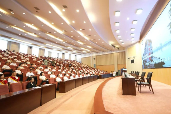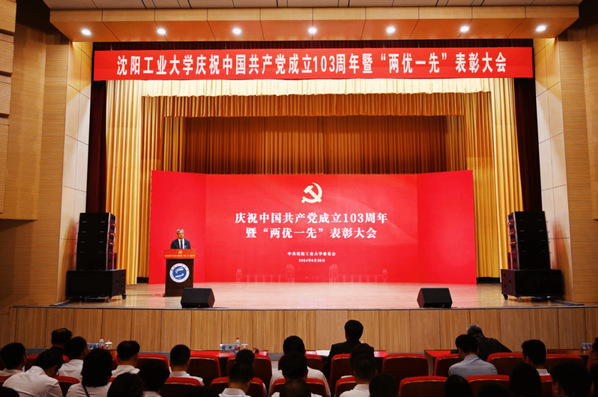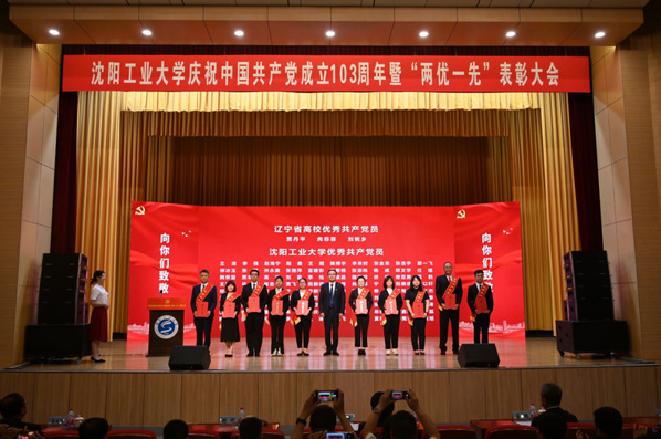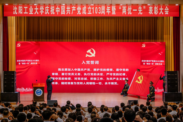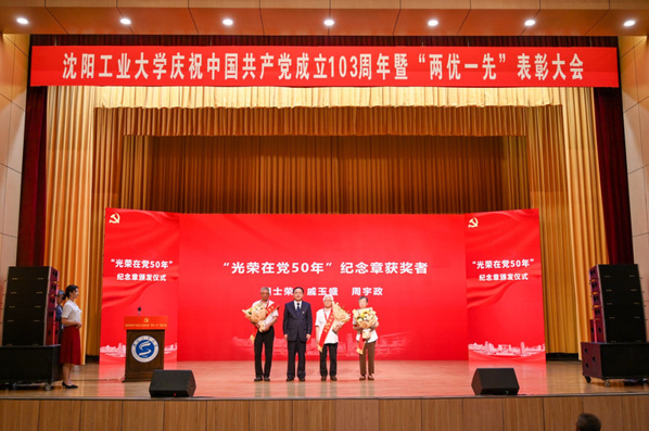 6月28日,沈阳工业大学隆重举行庆祝中国共产党成立103周年暨“两优一先”表彰大会,庆祝党的生日,部署党建领航工程,发出团结奋斗向一流的号召,为老党员代表颁发“光荣在党50年”纪念章,集中表彰优秀个人和先进集体。学校党委书记贾玉明出席会议并讲话,党委副书记、校长张珂主持会议,校领导聂鹏、陈延明、陈卫国、柯丽、孙秋野、臧喜民出席会议。学校全体中层干部,沈阳校区组织员、党支部书记,受表彰的个人和集体代表及师生党员代表500余人参会。