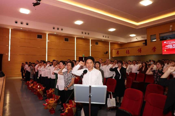 在罗文波的带领下,学校教师举起右拳重温《人民教师誓词》,铿锵誓言彰显了全体教师对教育事业的热爱,同时也体现了他们对教育事业的忠诚以及对学生的庄严承诺。