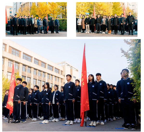 7时整,国旗护卫队队员们动作整齐划一,步伐铿锵有力,护送国旗入场。随着国歌声响起,五星红旗冉冉升起,全体师生肃穆站立,向国旗行注目礼,共唱国歌。