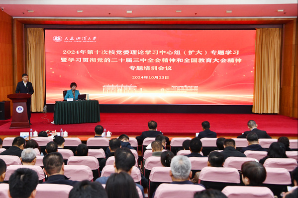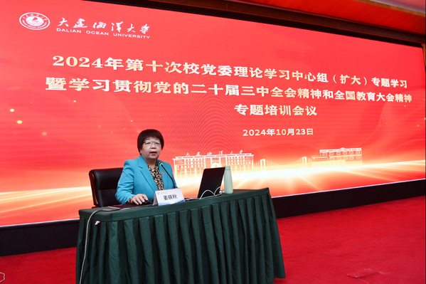 10月23日,大连海洋大学召开2024年第十次校党委理论学习中心组(扩大)专题学习暨学习贯彻党的二十届三中全会精神和全国教育大会精神专题培训会议,会议设主会场和分会场。会议邀请省政协智库专家、辽宁社会科学院姜晓秋研究员作《学习贯彻党的二十届三中全会精神和全国教育大会精神 立德树人 以新质生产力赋能辽宁海洋经济高质量发展》专题报告。学校领导、党委常委、全校各级理论学习中心组成员、副处级以上领导干部、组织员、辅导员、科级年轻干部共计270余人参加会议。会议由学校党委常委、宣传部部长张强主持。