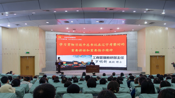 报告会邀请辽宁省委党校工商管理教研部主任罗明新教授,以《学习贯彻习近平总书记在辽宁考察时的重要讲话和重要指示精神》为题作专题辅导。报告从“新时代推动辽宁全面振兴的最新要求”和“推动新时代辽宁全面振兴的实践路径”两个方面,就如何学习宣传贯彻习近平总书记重要讲话和重要指示精神进行了深入阐释。报告既有理论高度,又有现实思考,既有全面宏观论述,又有具体数据分析,对深刻理解和准确把握习近平总书记重要讲话和重要指示精神具有很好的指导和推动作用。