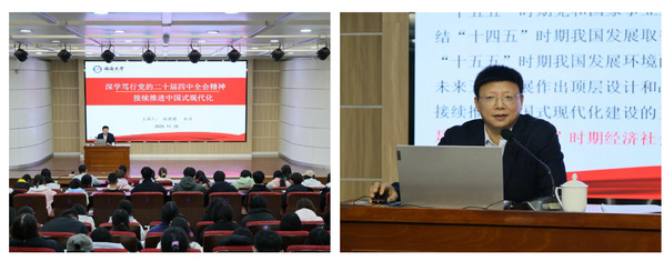 赵建国以“深学笃行党的二十届四中全会精神,接续推进中国式现代化”为题作宣讲,围绕学习贯彻习近平总书记在党的二十届四中全会上的重要讲话和《中共中央关于制定国民经济和社会发展第十五个五年规划的建议》,从准确把握“十五五”时期在基本实现社会主义现代化进程中的重要地位;深刻领会“十五五”时期经济社会发展的指导方针和主要目标;全面理解“十五五”时期经济社会发展的战略任务和重大举措;坚持和加强党的全面领导,凝聚起推进中国式现代化的磅礴力量等方面进行宣讲。